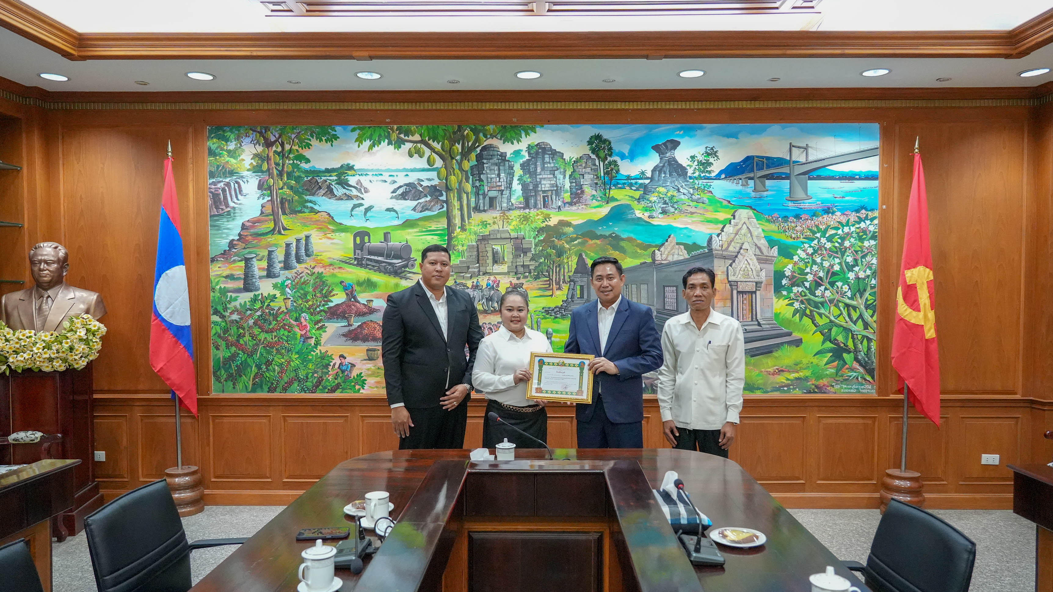 ກຸ່ມບໍລິສັດ ສະຫະບໍລິສັດລາວບໍລິການ ມອບເງິນ 1 ຕື້ກີບໃຫ້ແຂວງຈຳປາສັກ ປະກອບສ່ວນຊຸກຍູ້ກອງປະຊຸມໃຫຍ່
