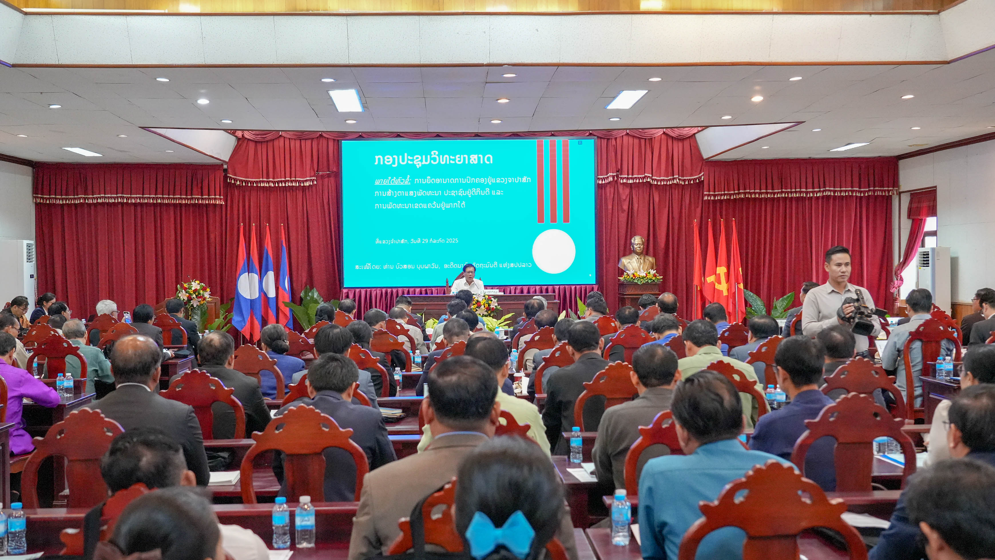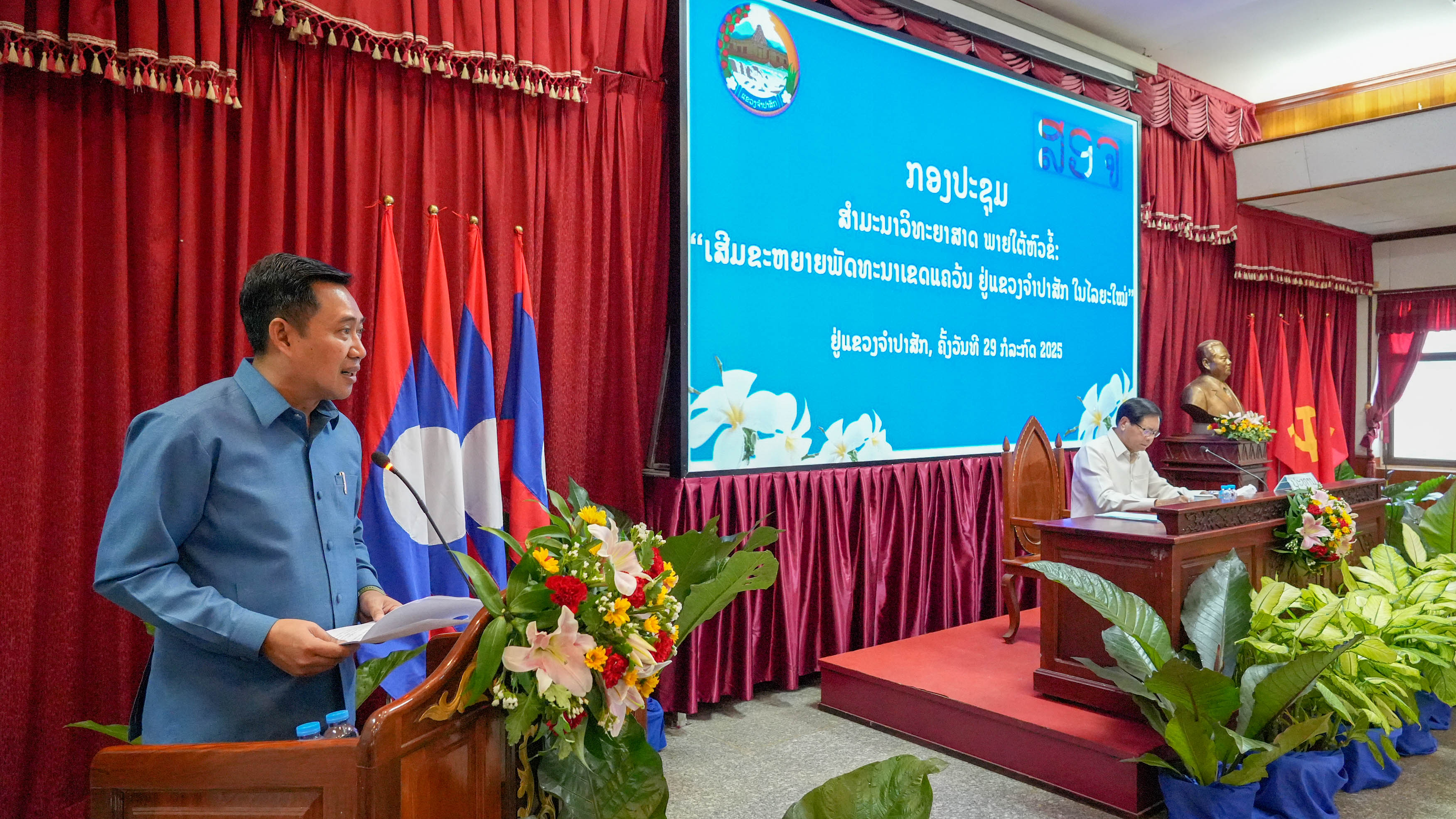 ກອງປະຊຸມ ສຳມະນາວິທະຍາສາດ ພາຍໃຕ້ຫົວຂໍ້ ‘‘ເສີມຂະຫຍາຍພັດທະນາເຂດແຄວ້ນ ຢູ່ແຂວງຈຳປາສັກ ໃນໄລຍະໃໝ່’’ ໄດ້ຈັດຂຶ້ນໃນວັນທີ 29 ກໍລະກົດຜ່ານມາ ທີ່ແຂວງຈໍາປາສັກ, ໂດຍໃຫ້ກຽດເປັນປະທານຂອງ ທ່ານ ບົວສອນ ບຸບຜາວັນ ອະດີດກຳມະການກົມການເມືອງສູນກາງພັກ ອະດີດນາຍົກລັດຖະມົນຕີ, ມີທ່ານ ອາລຸນໄຊ ສູນນະລາດ ກຳມະການສູນກາງພັກ ເລຂາພັກແຂວງ ເຈົ້າແຂວງຈຳປາສັກ.